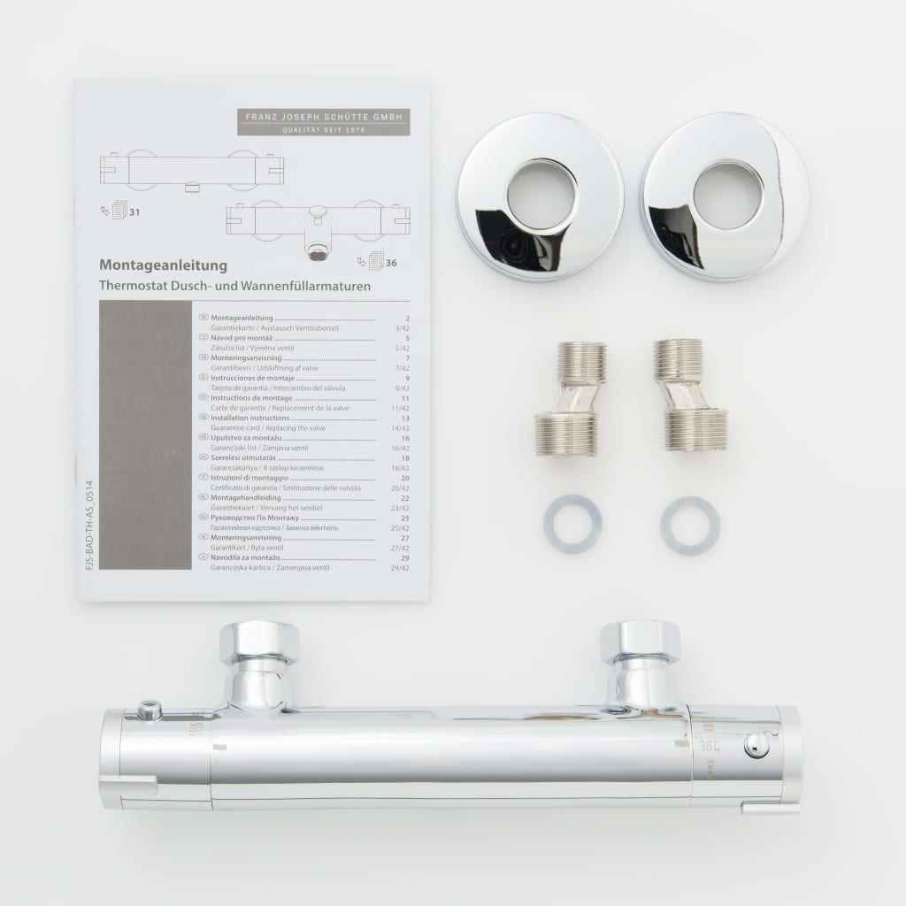 The high-quality, water-saving thermostatic shower mixer tap LONDON from SCHÌÏTTE is a perfect choice for every bathroom. The bathroom mixer tap features a replaceable thermostat element and temperature scale with child-protection at 38 å¡C. Its unique Eco-Stop-Function contributes to up to 50% less water consumption. Thanks to its chrome-plated surface, this mixer tap has a reflective sheen, and the solid brass construction makes the bathroom tap highly durable. The mixer tap is easy to install and clean.