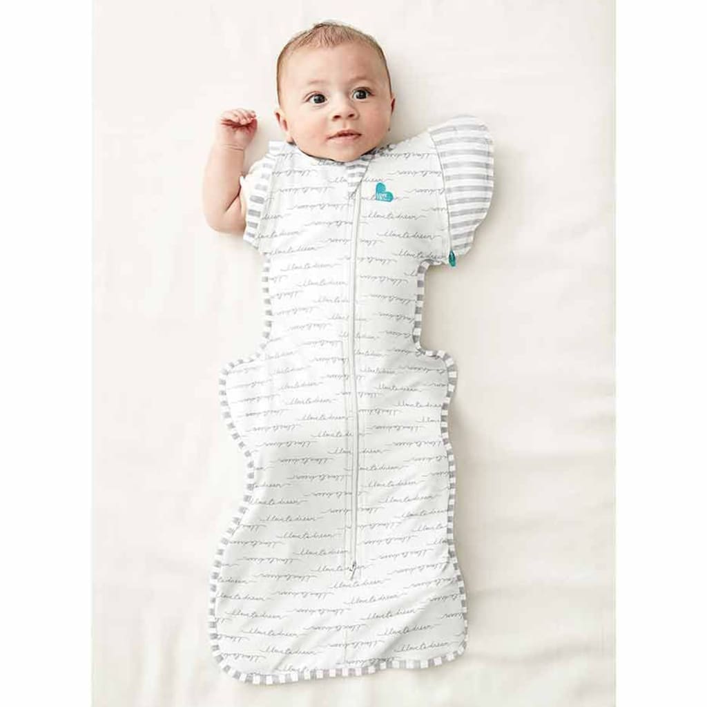This cute L white Swaddle UP Transition baby swaddle from Love to Dream keeps your baby snugly and comfortable, without worrying about loose blankets to kick off during sleep. The SwaddleUp Transition is a practical swaddle sleeping bag for babies from 6 to 9 months. Swaddling helps your baby sleep if he/she is restless, cries a lot, has trouble falling asleep and then wakes up quickly. This Transition Swaddle can be used to transition from any type of swaddle. The easiest and genlest way to help your baby graduate from swaddling while maintaining the snug secure feeling of being swaddled.Just place your baby's legs in the leg section, and their arms in the "wings" of the baby swaddle blanket. Wrap the sides over the baby and attach them with the zip over the chest. This allows your baby to sleep in a natural position with its arms up. Additionally, your little one can access their hands for true self-soothing. The sleeping bag design also prevents babies from rolling over. This baby swaddle system offers the security that your little one needs to sleep well, but it is not tight and regulates the heat. There is also enough space for the baby to move the hips and legs. The swaddle has no cords to come loose, or hook and loop fastenings that could injure a baby, but closes with a concealed two-way zip. To change the diaper you only have to open the zip. The surface of this baby wrap is soft, gentle, as well as breathable. It is also very comfortable and convenient to use for the parent.